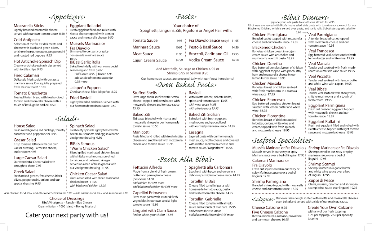 BiBa's Italian Restaurant in Lawrenceville invites diners to indulge in authentic Italian flavors crafted with care. The menu boasts standout pasta dishes like the creamy Pasta alla Biba's, a rich fettuccine Alfredo made from fresh cream, butter, and Parmigiano cheese, with optional chicken additions for hearty appeal. Lovers of light, vegetable-forward plates will appreciate the Capellini Primavera, featuring extra-thin pasta tossed with fresh sautéed vegetables in a special light tomato sauce. Seafood enthusiasts can enjoy the Linguini with Clam Sauce, served in red or white sauce, while the Spaghetti alla Carbonara offers a comforting blend of bacon and onions.